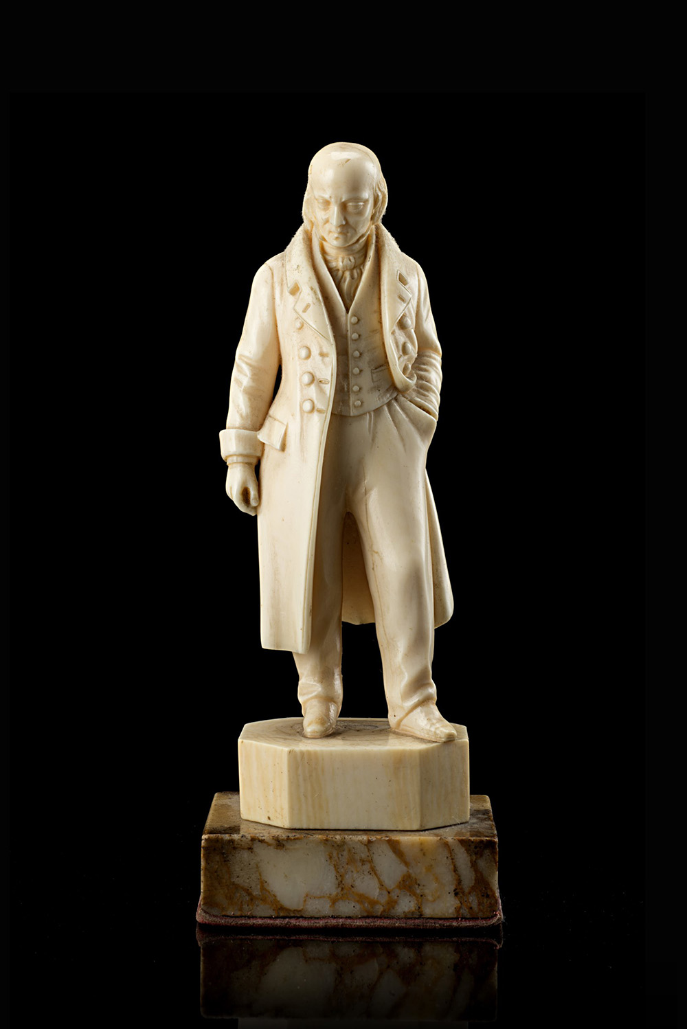 Scultore del secolo XIX. Gruppo in avorio intagliato a tutto tondo raffigurante un gentiluomo con lungo cappotto (h. cm 15) poggiante su base in marmo