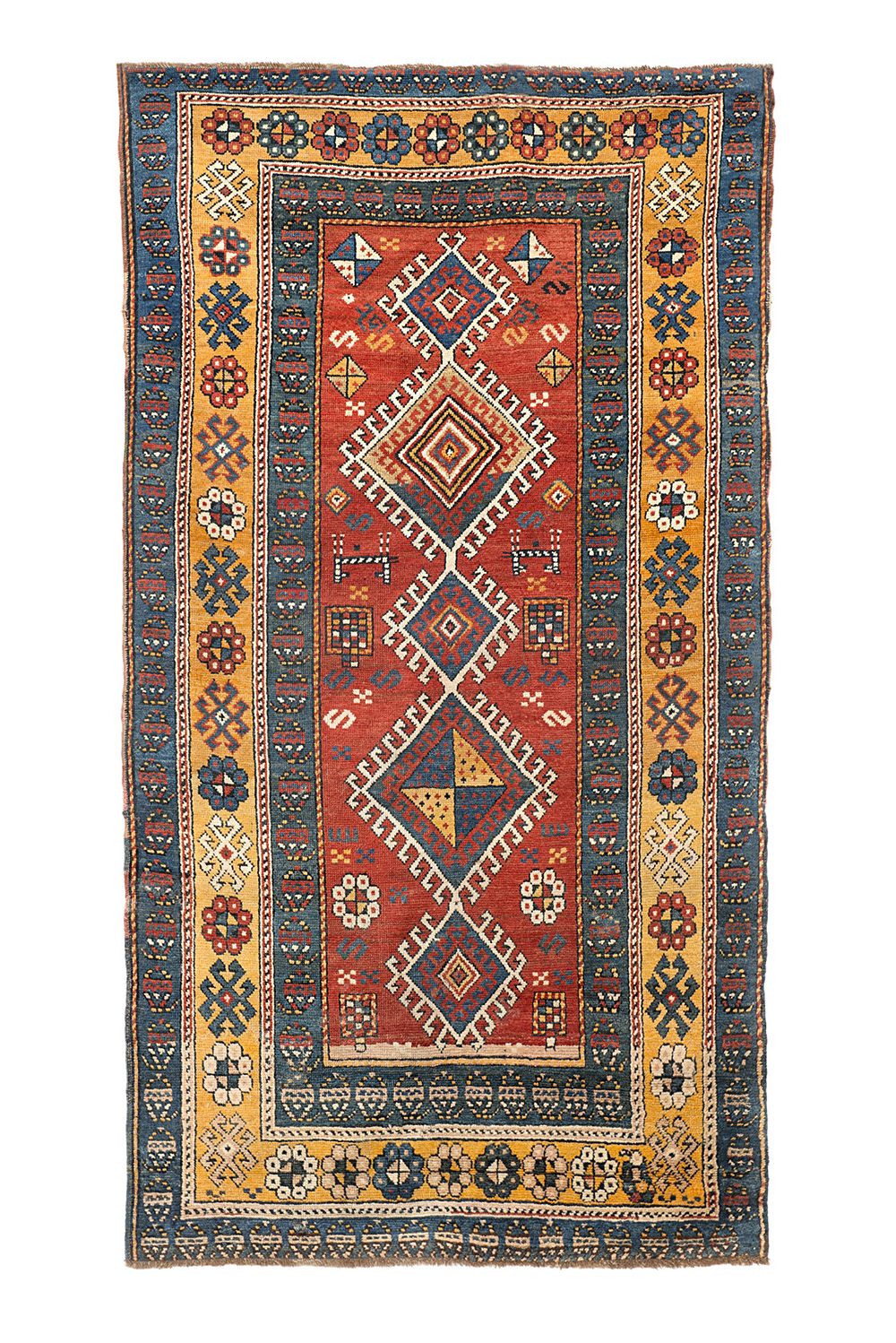Disegno a fondo rosso con medaglioni uncinati romboidali di dimensioni e colori differenti, decorati con motivi geometrici. Bordura principale a fondo giallo zafferano con rosette e granchi tipici caucasici. Bordure secondarie a fondo azzurro carta da zucchero con Boteh stilizzati. (cm 237x134) (difetti)