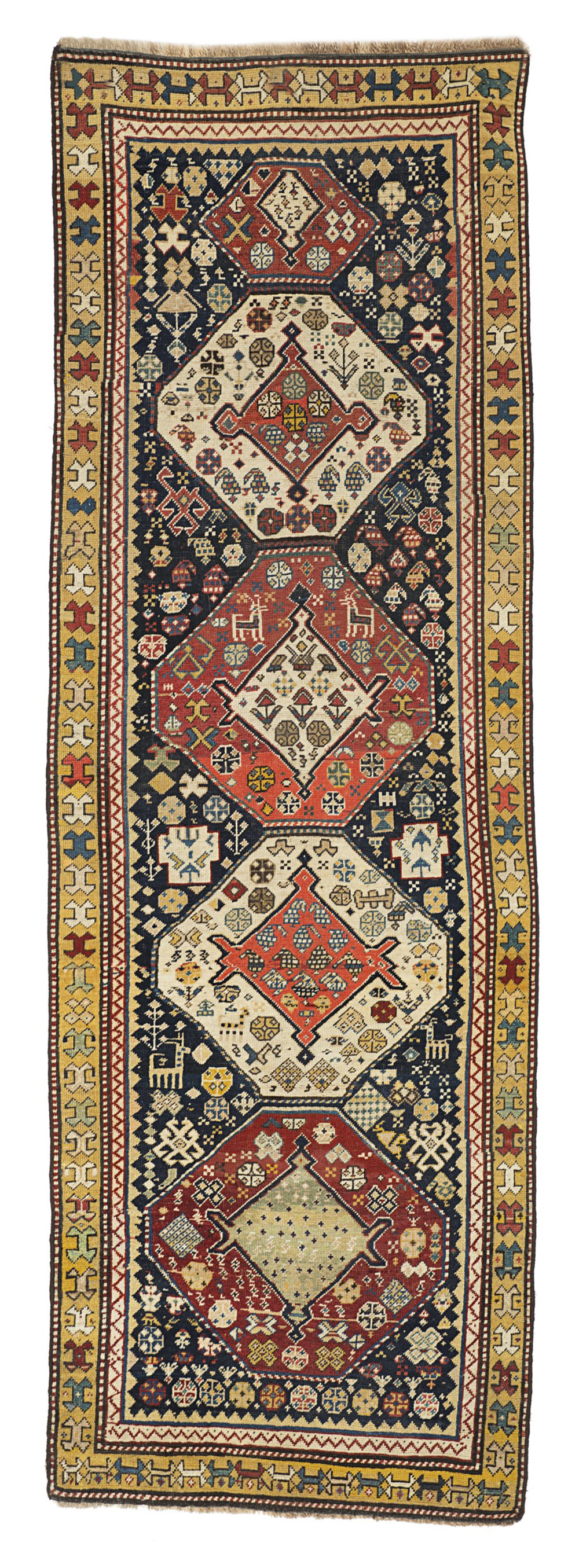 Disegno con cinque medaglioni ottagonali su fondo blu notte. Al centro dei medaglioni, color bianco, rosso e bordeaux, spiccano rombi con colori contrastanti e decorati da Boteh stilizzati.Il campo è cosparso da simboli tipici della provenienza. Bordura principale a fondo giallo con decori geometrici policromi. (cm 255x89) (difetti)