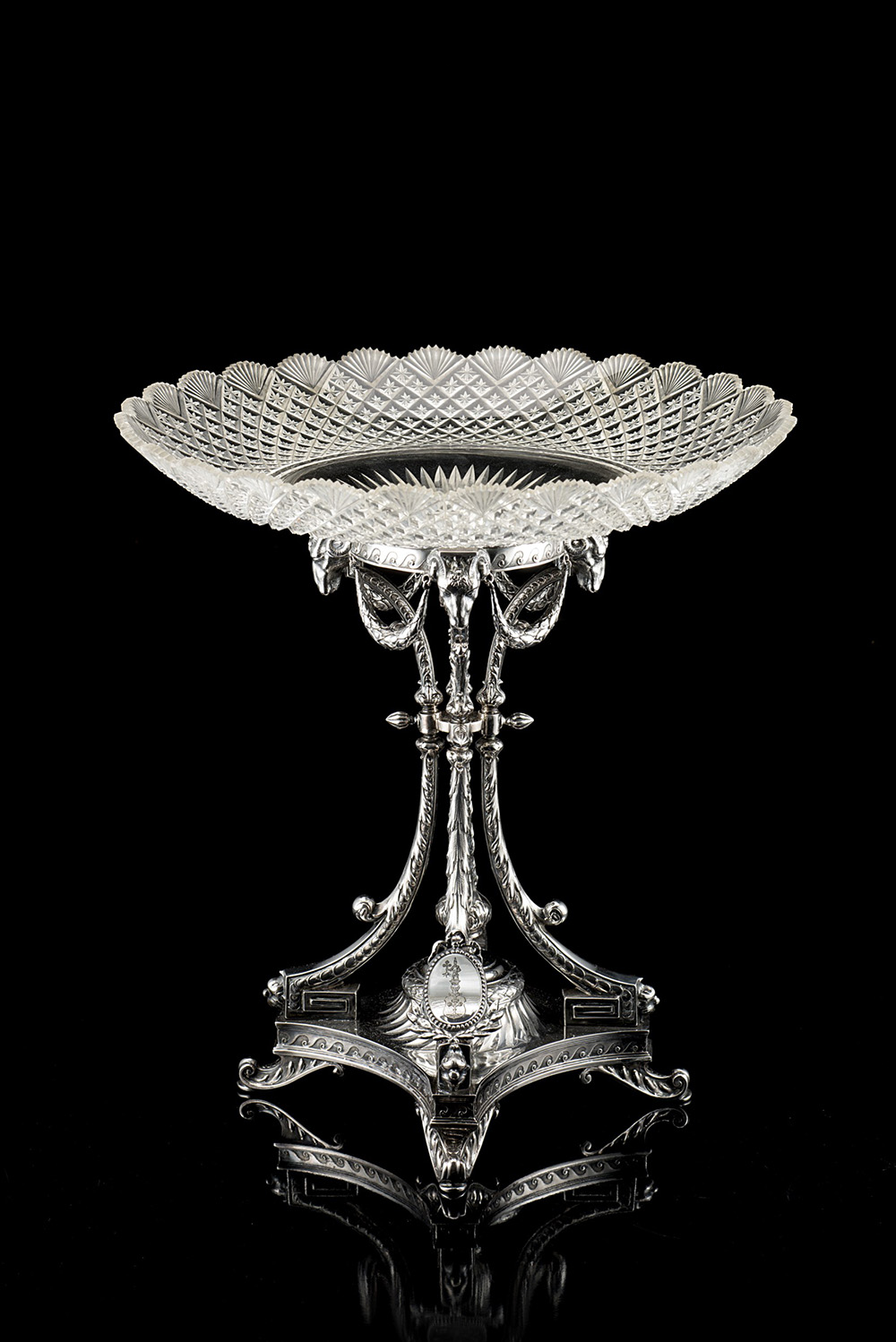 Centrotavola in argento e cristallo, con piedistallo a quattro montanti su base quadrata falcata, ghiera e cesta di forma circolare, decorato da teste di ariete raccordate da festoni, graticci e scanalature molati, fasce di onde vitruviane, boccioli, rilievi fogliati e medaglioni; quattro piedini a voluta. Marchio dell’ufficio di assaggio di Odessa (Russia) 1882-1898, per merci importante (h. tot. cm 36 ca.; d. piatto 34,5 ca.) (g supporto 1060 ca.)