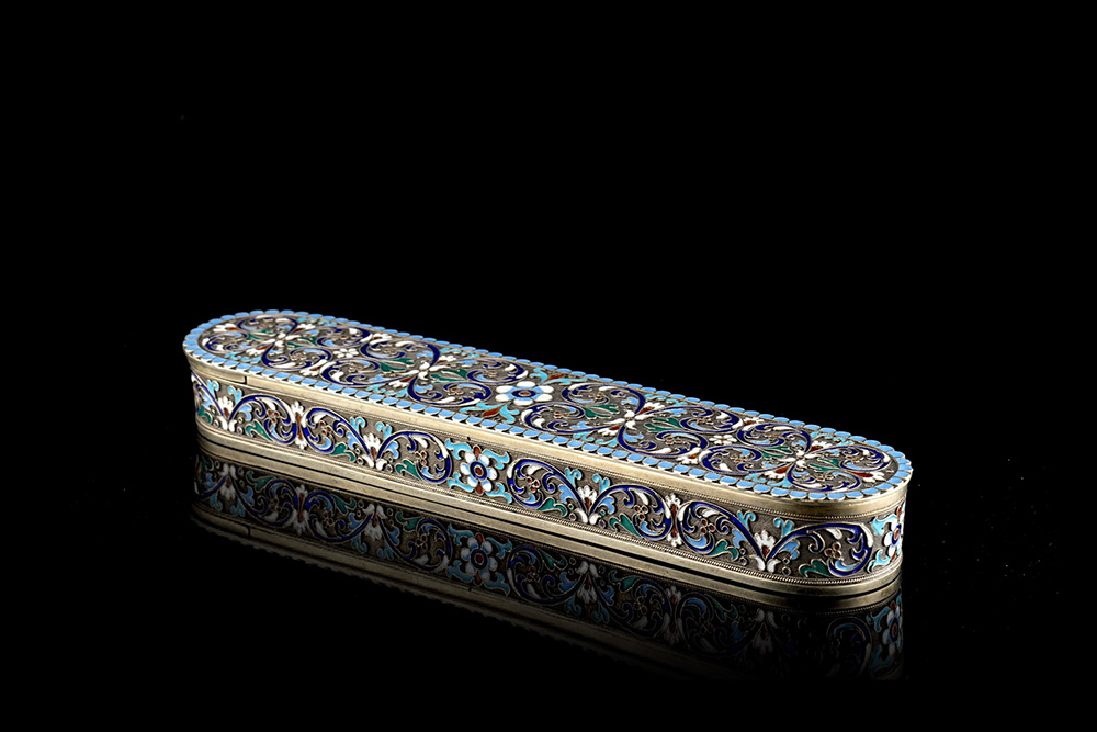 Porta penne in argento e smalti policromi cloisonnè, decorato con motivi floreali stilizzati e perlinatura. Marchi di imitazione di San Pietroburgo 1896-1898 e dei fratelli Grachev (cm 21x4,5 h. cm 2,5 ca.) (g 420 ca.)