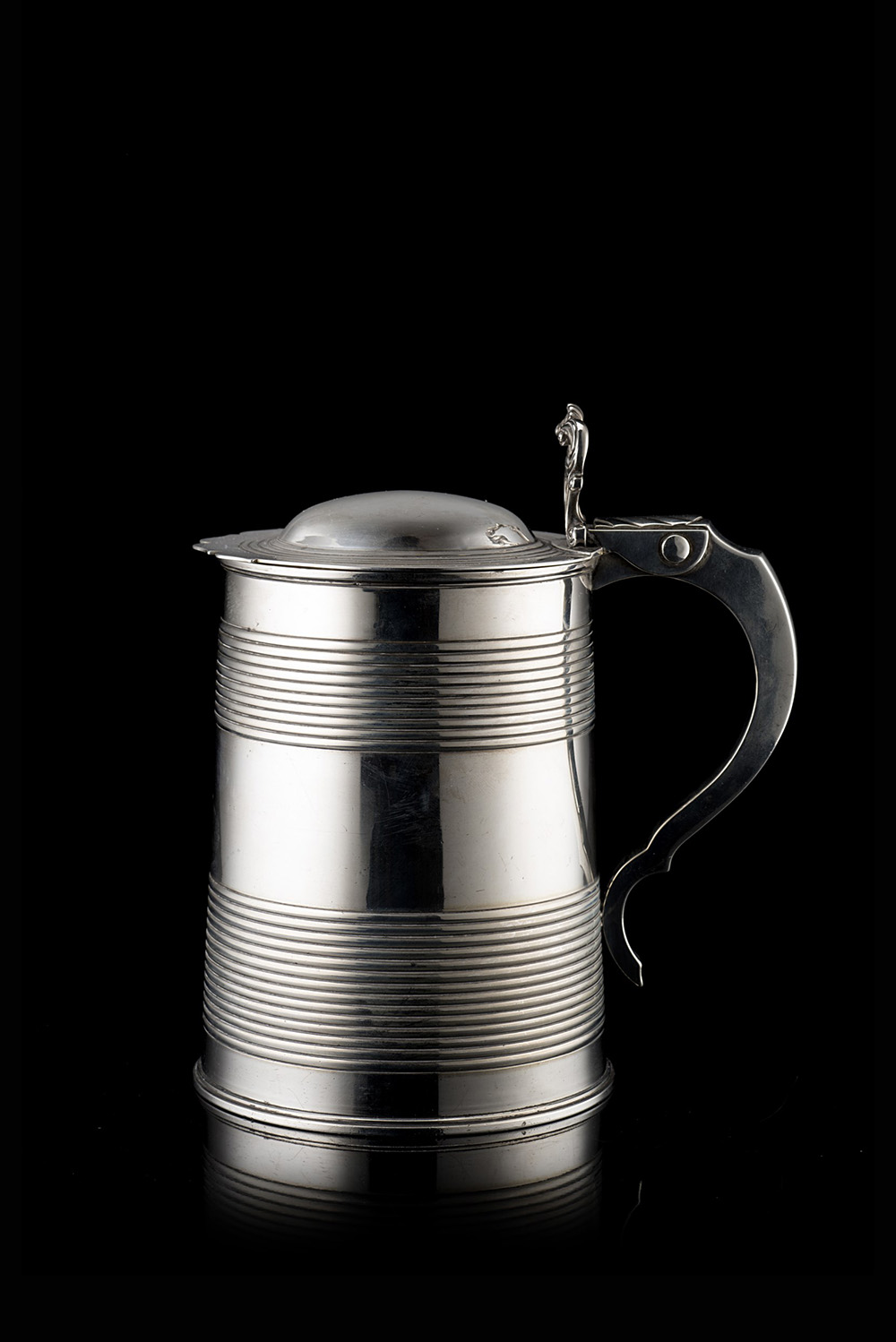 Tankard in argento a corpo cilindrico e coperchio bombato, decorati a fasce scanalate su fondo liscio. Manico ad ansa squadrata; interno in vermeil. Londra, 1820 (argentiere Hayter ?) (h. cm 19) (g 1035 ca.) (lievi difetti)