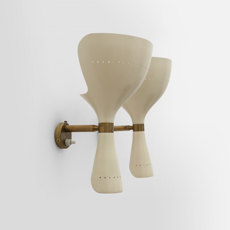 DUE LAMPADE A PARETE, anni '50. Ottone, alluminio laccato. Altezza cm 26,...