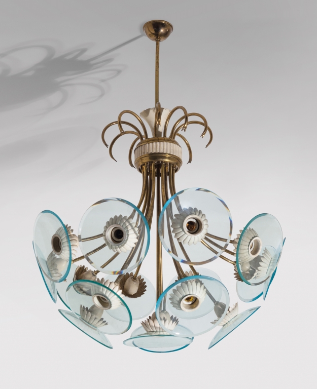 FONTANA ARTE Un lampadario, inizi anni '50. Ottone lucido e laccato,...