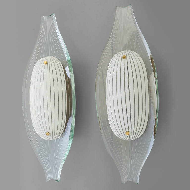 Lotto 2065 | MAX INGRANDDue lampade a parete "2340", 1965. Cristallo sagomato curvato,...