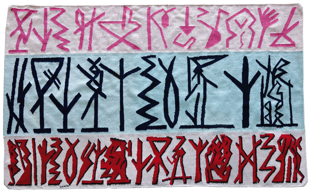 RICCARDO LICATA Torino 20/12/1929 A 13, 2001 arazzo in lana, kilim, manifattura Wissenbach, Bhadohi cm. 154x209, firma in basso a sinistra, pubblicato sul catalogo della mostra "Licata, arazzi", Verso l'Arte Edizioni, a cura di Giovanni Granzotto, tenutasi presso il Circolo degli Artisti (TO), Palazzo Graneri nel marzo-aprile 2002, in copertina, pagina 77 e pagina 35 (particolare).