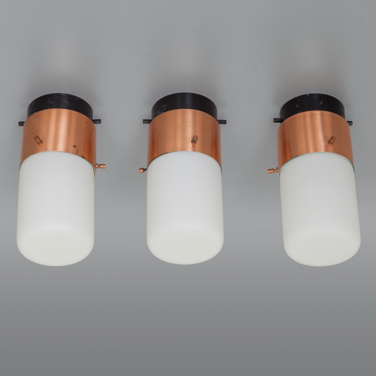 STILNOVO Tre lampade a plafone "1245", anni '60. Rame spazzolato, alluminio...