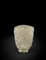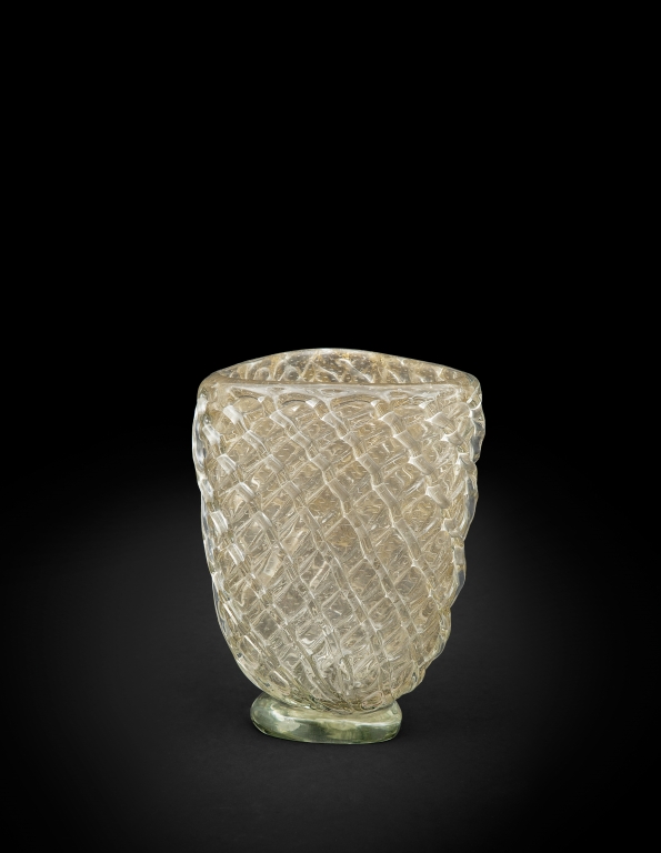 Un vaso a sezione triangolare in cristallo a bollicine, circa 1938, con applicazione di foglia d'oro e di canne di cristallo disposte a rete.