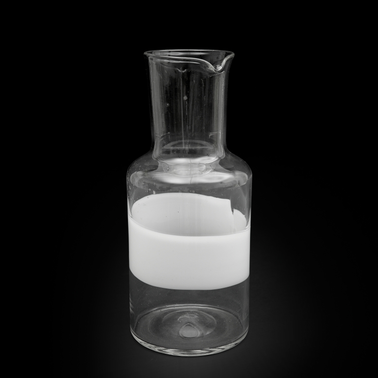 Una caraffa in cristallo con fascia in vetro lattimo, circa 1950.