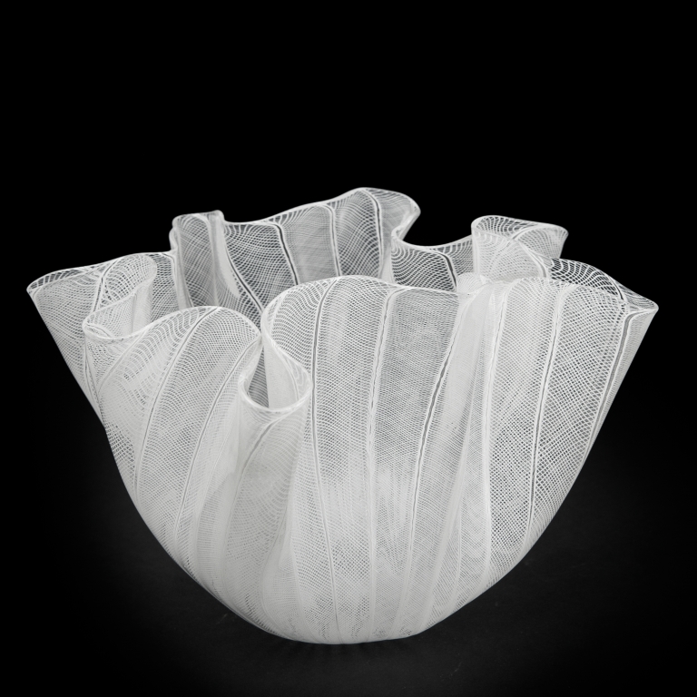 FULVIO BIANCONIUn vaso a fazzoletto in vetro a canne di reticello lattimo,...
