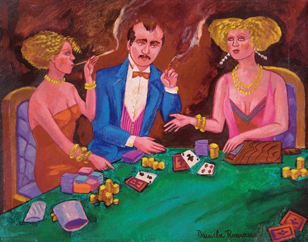 DANIELA ROMANO Napoli 27/11/1947 - Roma 27/06/2009 Cento e stò olio su tela cm. 35x45, firma in basso a destra, titolo e firma al retro, dichiarazione d'autenticità dell'artista e timbro della Galleria Arte Santerasmo (MI) su foto.