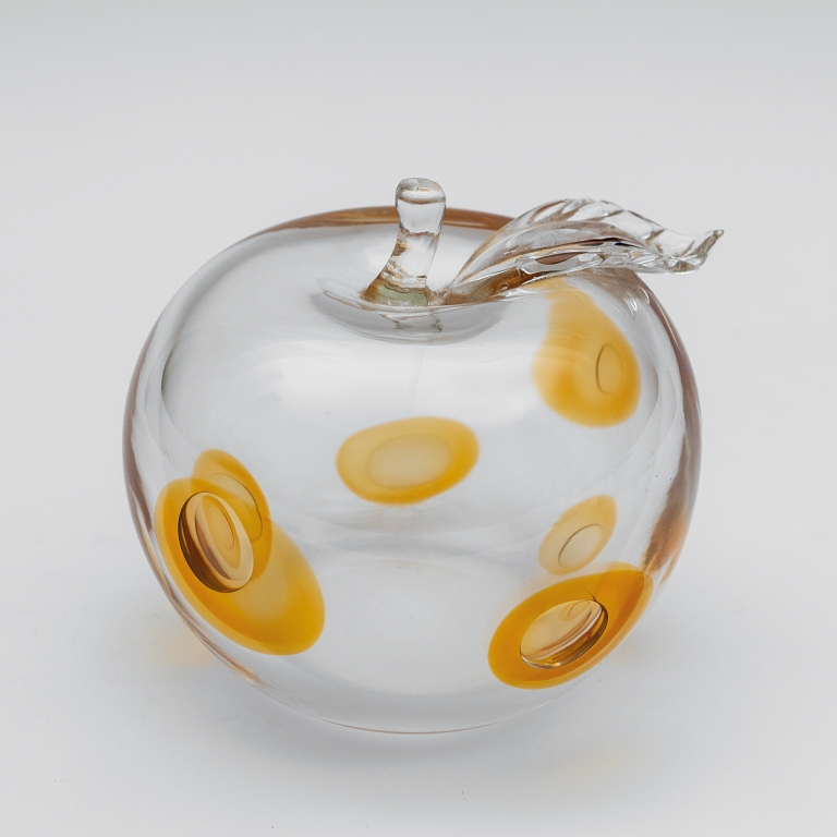 Una mela in cristallo con bolle cerchiate da vetro ambra, circa 1955.