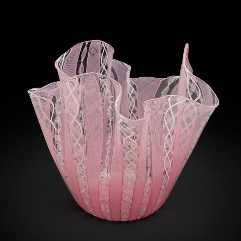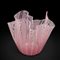 Un vaso a fazzoletto a canne di reticello zanfirico rosa e lattimo, 1986.