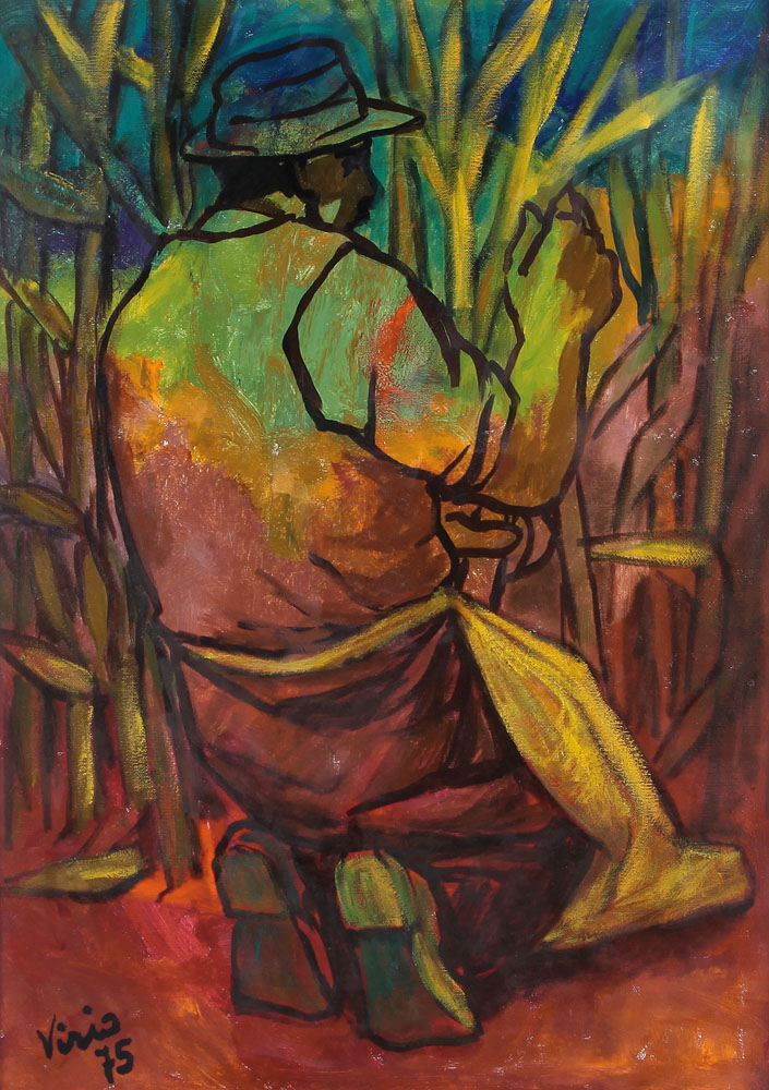DA SAVONA VIRIO Verona 20/07/1901 - Albissola Marina (Sv) 23/06/1995 Raccoglitore di granoturco, 1975 olio su tela cm. 70x50, firma e anno in basso a sinistra, titolo, firma e anno su etichetta dell'artista al retro.