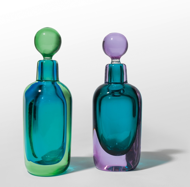 MARIO PINZONI, SEGUSO VETRI D'ARTE Due bottiglie, anni '60. Vetro sommerso....