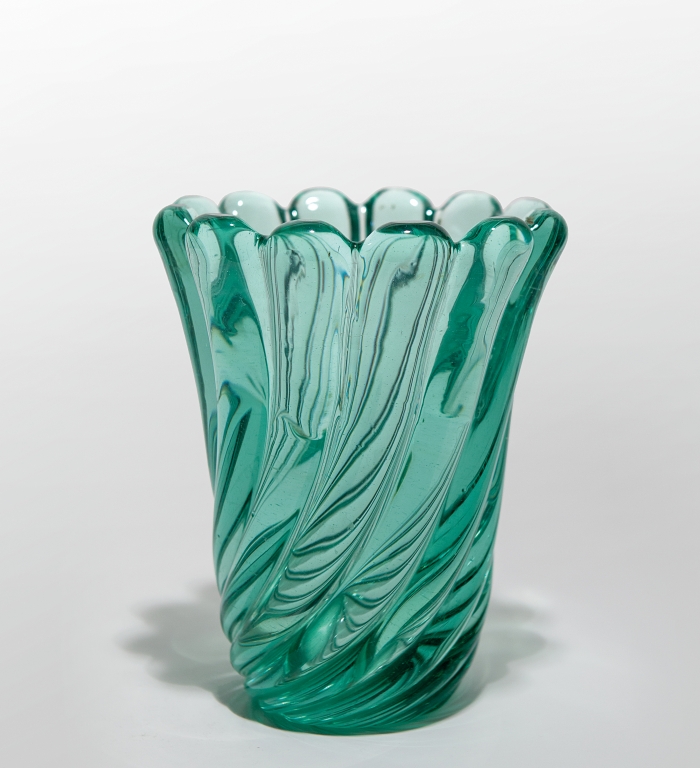 Un vaso in vetro pesante ritorto verdino, modello 7609, 1942.