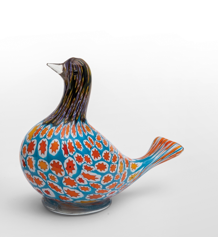 Figura di colomba in vetro a murrine stellate, base in cristallo, 1965.
