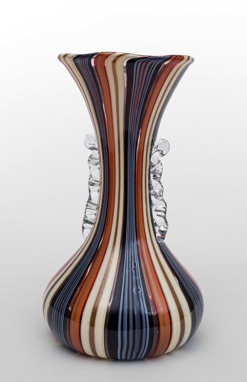 FRATELLI TOSO Un vaso a canne policrome verticali e avventurina con cordoni...