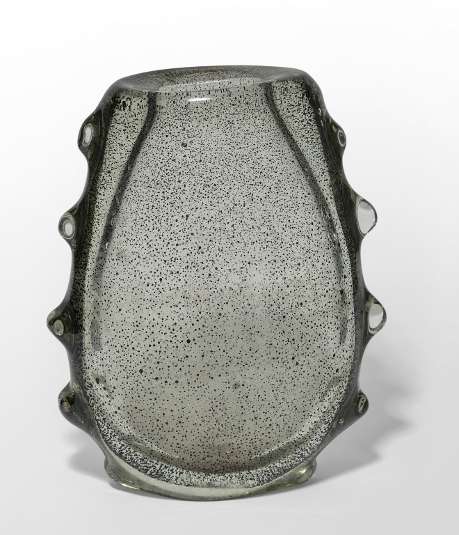 Un vaso in cristallo a bollicine metalliche e rilievi laterali, 1937.