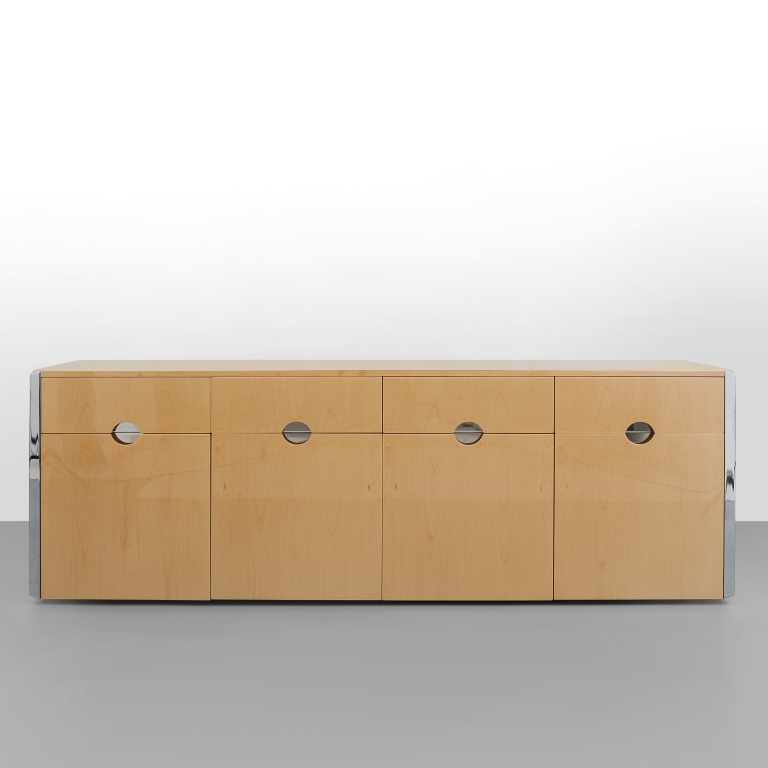 Maple wood veneered wood polished with polyester and chrome-platead brass, with a manufacturer's metal label.