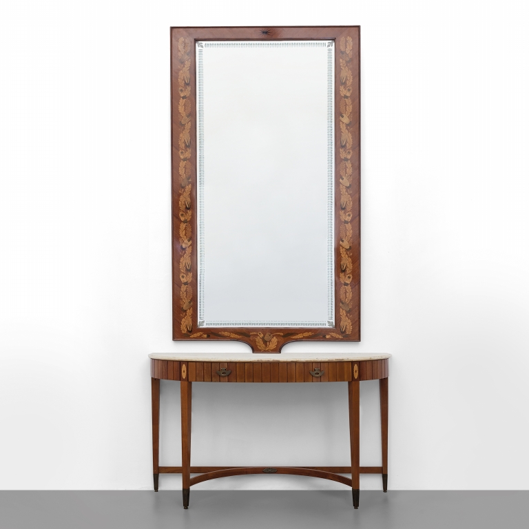 Console (legno di teak, ottone, onice): cm 85 (h) x 144 x 47 specchiera (legno di teak con tarsie in legni vari, cristallo inciso argentato): cm 200 x 112.