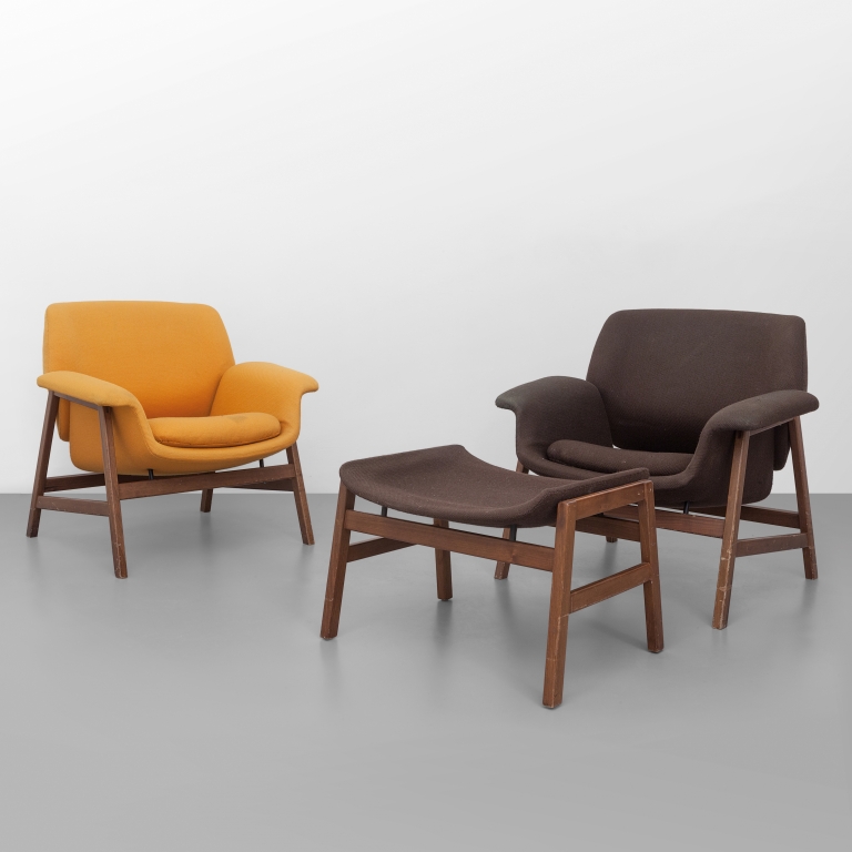 GIANFRANCO FRATTINI Due poltrone "849" e uno sgabello "849/S" per CASSINA,...