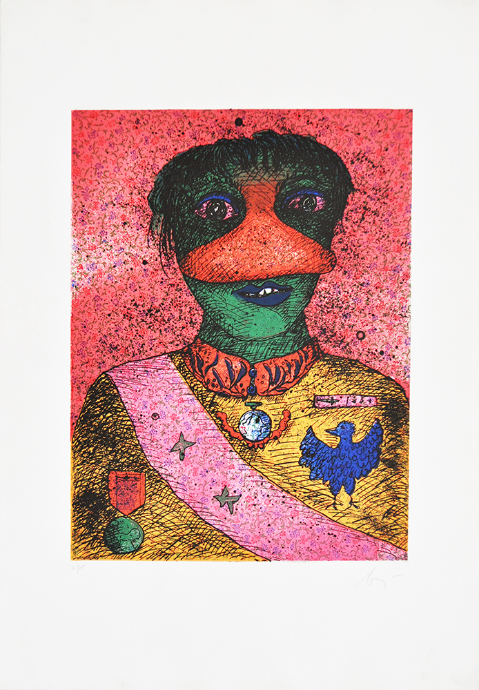 Lotto 12 | ENRICO BAJ, Personaggio, Acquaforte polimaterica a colori, es. 35/75, cm....