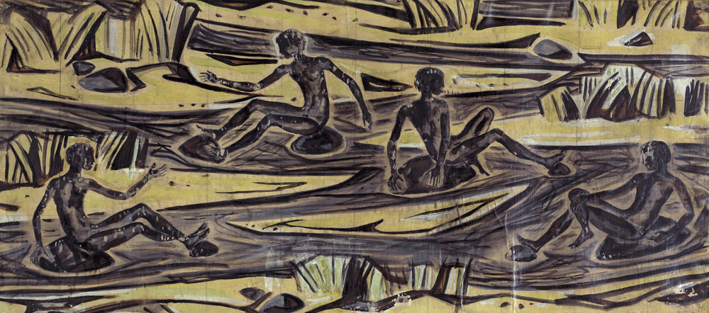 XAVIER BUENO Vera De Bidasoa (Spagna) 1915 - Fiesole (Fi) 17/07/1979  Ragazzi al fiume, 1955 tecnica mista su carta intelata cm. 38x84, firma in basso a destra, timbro della Galleria d'Arte La Colonna (MI) al retro, opera registrata presso l'Archivio Xavier Bueno come da dichiarazione su foto, pubblicato sul Catalogo Generale, volume II pagina 55 al numero 228.