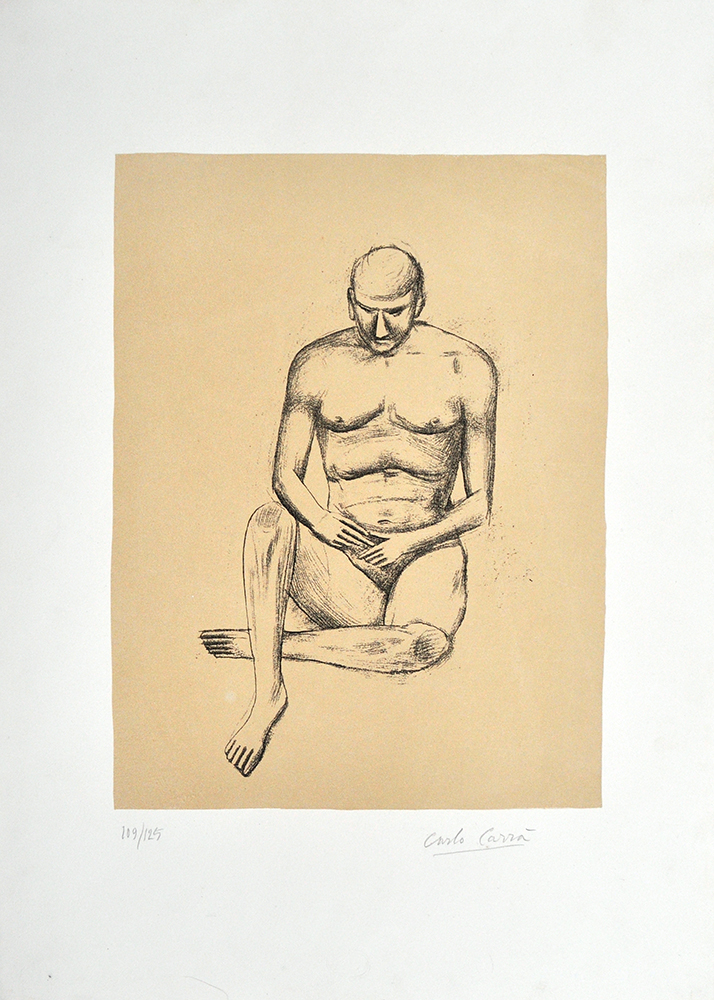 CARLO CARRA’, Nudo, 1961, Litografia a due colori, cm. 65×45,5, es. 109/125, Firma in basso a destra, Tiratura in basso a sinistra, Bibliografia: Il Bisonte – Litografie e incisioni originali – Catalogo, Edizioni Il Bisonte, Firenze, tav. 147, ripr.