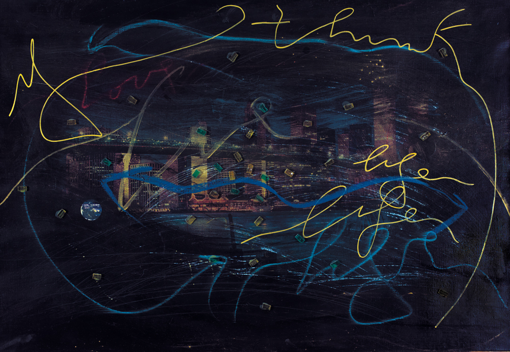 MARCO NEREO ROTELLI Venezia 14/05/1955 New York, 2003 tecnica mista e applicazioni su tela cm. 68,5x99,5; firma e titolo al retro, dichiarazione d'autenticità dell'artista su 2 foto, opera senza cornice.