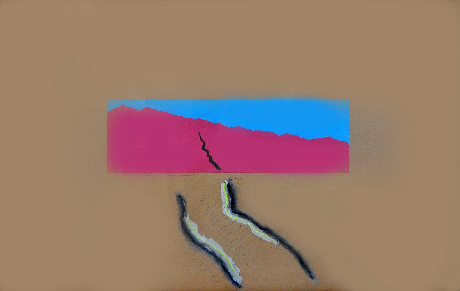 FRANCO GUERZONI, Rilievo di un torrente, 1970, Tecnica mista su cartone, cm. 74x104, Firma e data al centro a destra, Titolo al centro a sinistra