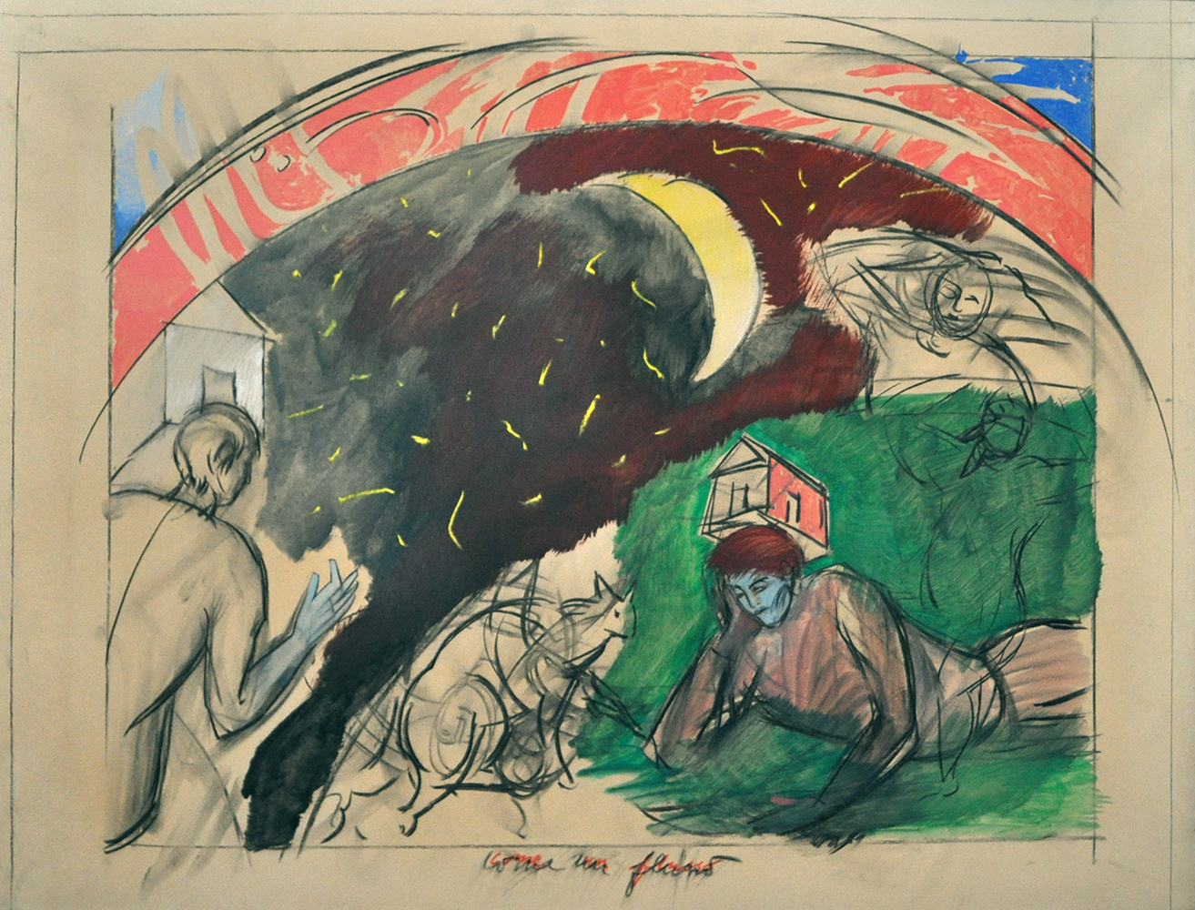 ROBERTO GIOVANNELLI, Come un flusso, 1987, Tecnica mista su cartoncino applicato su tela, cm. 74x98, Titolo in basso al centro, Firma sul retro, Esposizioni: Prato, Galleria Metastasio, testo in catalogo di Cesare Vivaldi, 1987