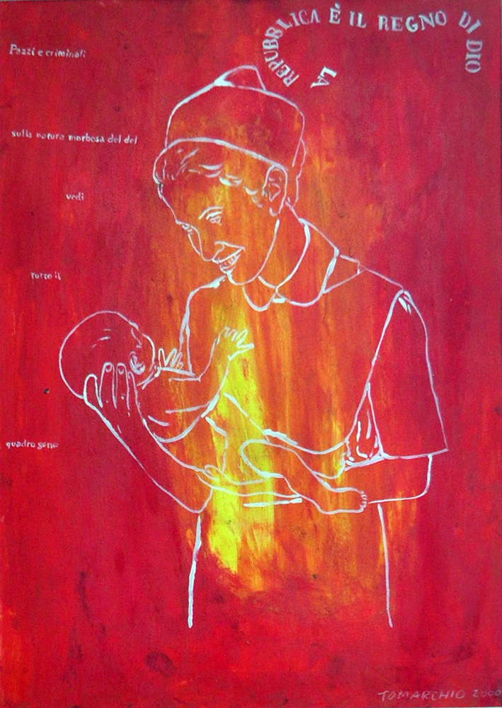 MICHELANGELO TOMARCHIO LEVI, La repubblica è il regno di Dio, 2000, Tecnica mista su cartone, cm. 50x35, Firma e data in basso a destra