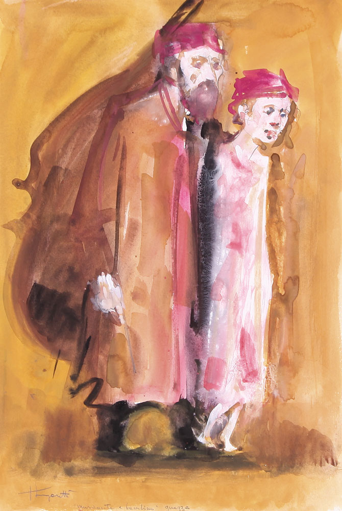 TRENTO LONGARETTI Treviglio (Bg) 27/09/1916 Viandante e bambino guazzo su carta cm. 46x31, firma, titolo e tecnica in basso a sinistra, dichiarazione d'autenticità dell'artista su foto.