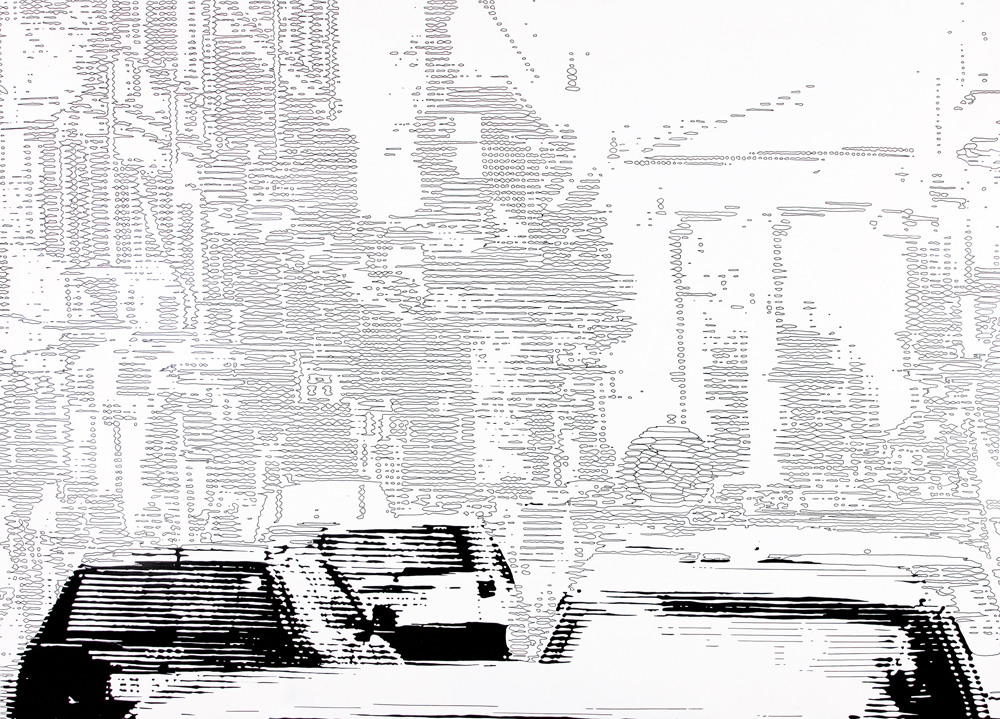 LEONIDA DE FILIPPI Milano 17/04/1969 Paesaggio urbano, 2009 smalto su tela cm. 100x140, firma, titolo, anno e tecnica al retro, dichiarazione d'autenticità dell'artista su foto, opera senza cornice.