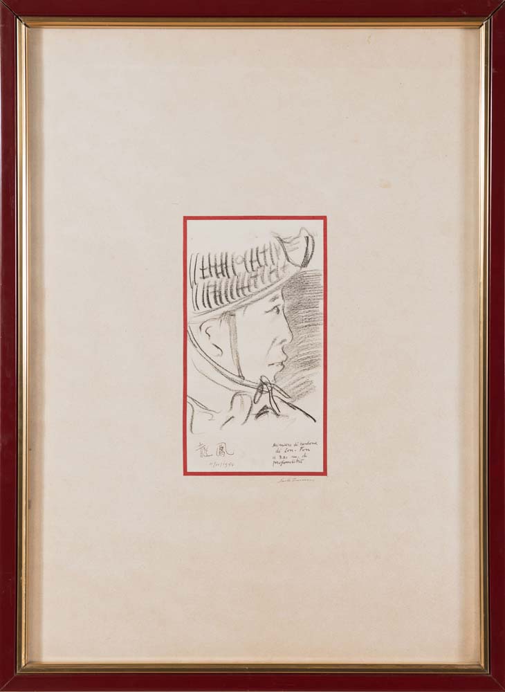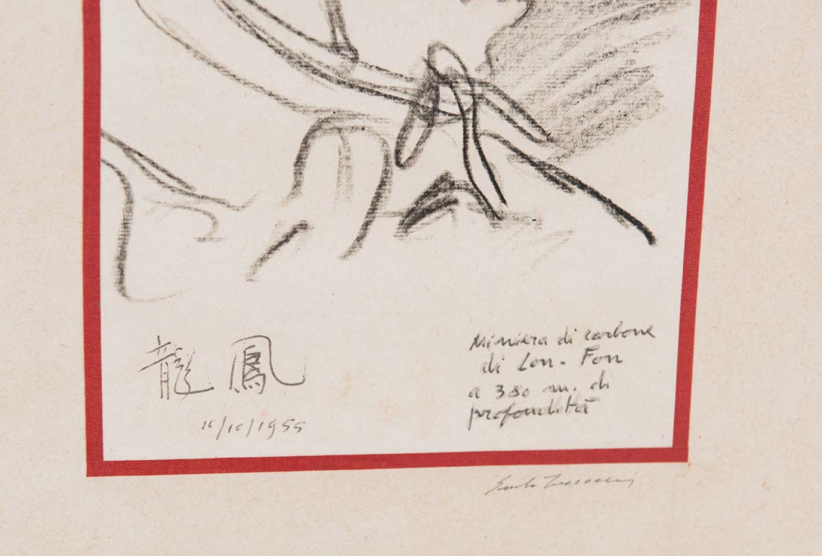 Erenesto Treccani (1920 - 2009), “Miniera di carbone di Lon-Fon a 380 metri di profondità”, 1955. Carboncino su carta, firmato in basso a destra Ernesto Treccani, datato in basso a sinistra 10.10.1955, al retro reca firma e dedica, H cm 27x14.5