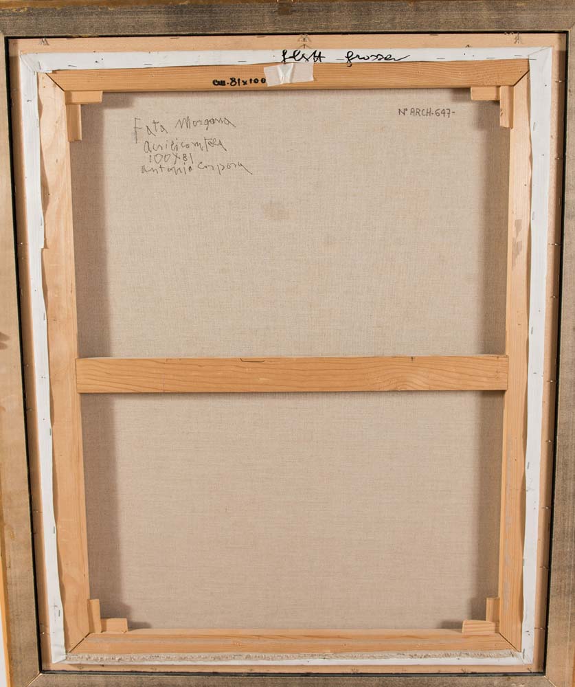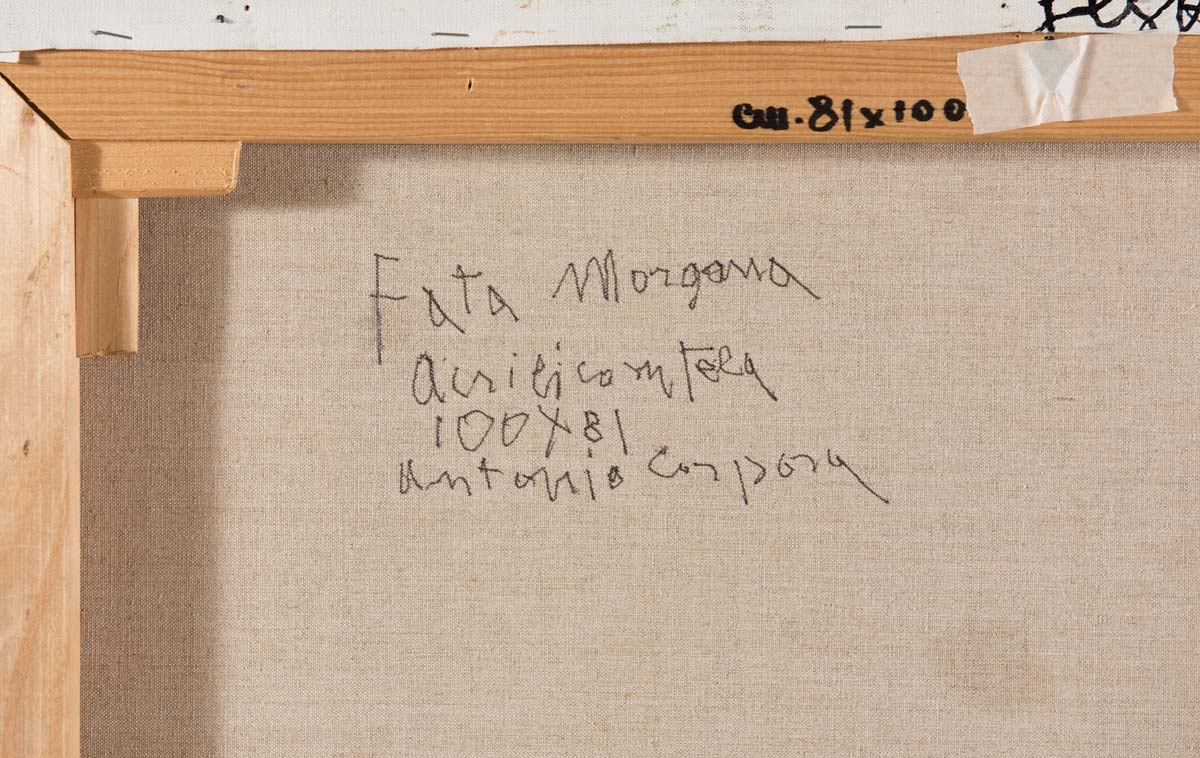 Antonio Corpora (1909 - 2004), “Fata Morgana”, 2002. Acrilico su tela, firmato in basso a destra Corpora, datato, titolato e firmato al retro ‘Fata Morgana’ - acrilico su tela 100x81 Antonio Corpora, H cm 100x81 Opera autentica registrata nell’Archivio Corpora per la pubblicazione del primo volume del catalogo generale a cura di Giovanni Di Summa con numero di Archivio 647, come riportato su certificato di autenticità fotografico firmato da Corpora in data 2003