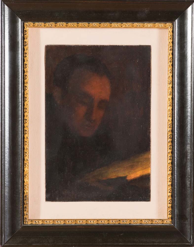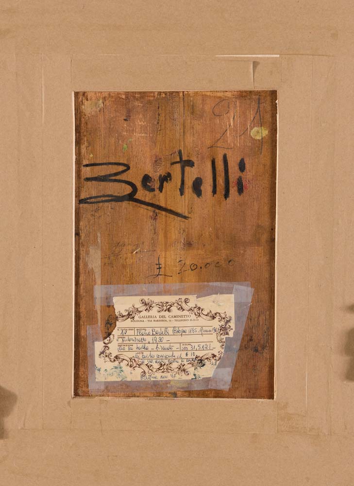 Flavio Bertelli (1865 - 1941), “Autoritratto”, 1920. Olio su tavola, firmato al retro Bertelli, H cm 31.5x21 Al retro reca etichetta della Galleria il Caminetto – Bologna; la tavola corrisponde al #10 del Catalogo della Mostra di Roma