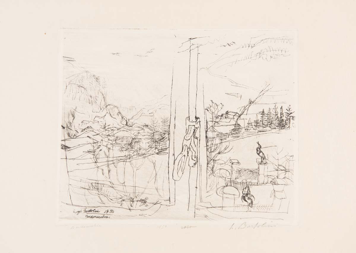 Luigi Bartolini (1892 - 1963), “Bardonecchia”, 1950. Incisione su carta, firmata in basso a destra L. Bartolini, data in basso al centro, titolo in basso a sinistra, H mm 456x612, lastra mm 287x350