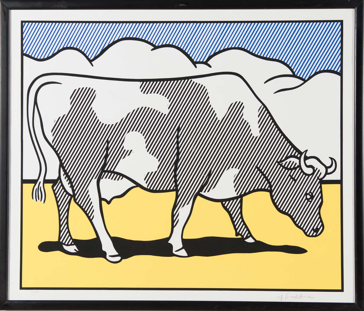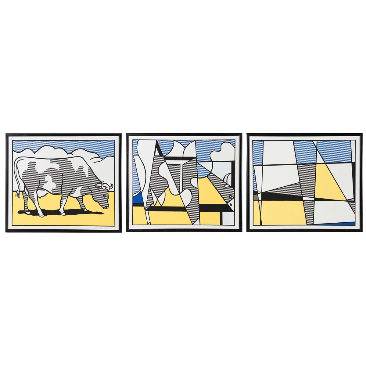 Roy Lichtenstein (1923 – 1997), “COW TRIPTYCH (COW GOING ABSTRACT)”, 1982. Serigrafia a colori, trittico firmato Roy Lichtenstein, esemplare 62/150, cad. H mm 650x770 Opera eseguita dalla Stamperia d'Arte Fratelli Alinari. Bibliografia: M. Lee Corlett, The prints of Roy Lichtenstein: a catalogue raisonné 1948-1993 New York 1994, p. 326