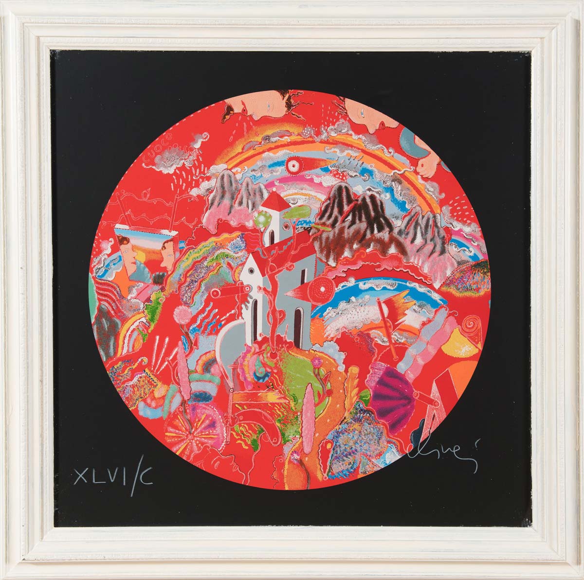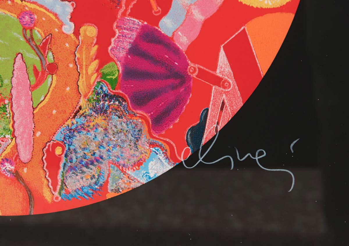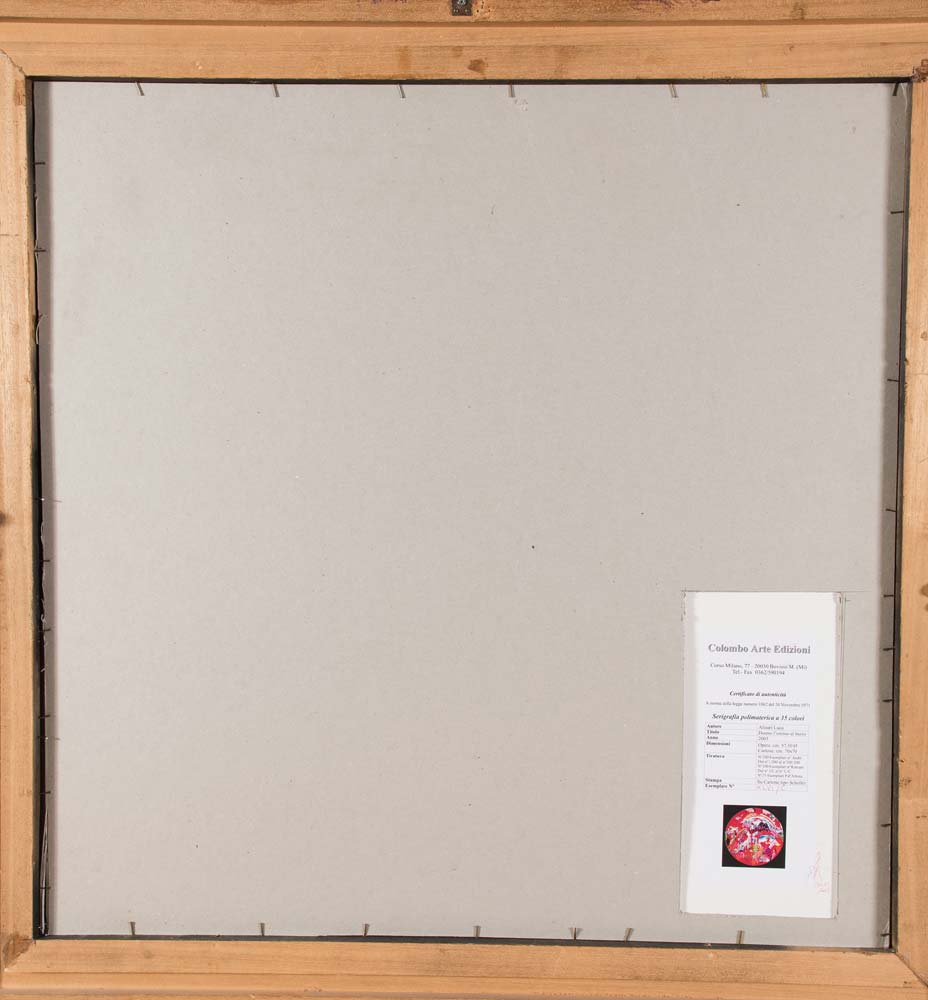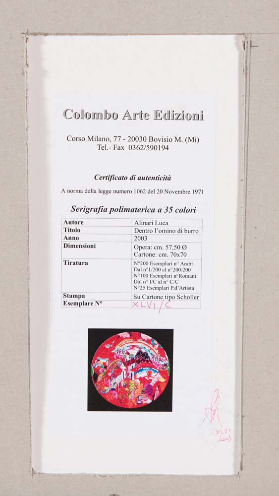 Luca Alinari (1943), “Dentro l’omino di burro”, 2003. Serigrafia polimaterica a 35 colori su carta, firmata in basso a destra Alinari, numero di tiratura XLVI/C, al retro reca etichetta, timbro e firma Colombo Arte Edizioni, H mm 700x700, diametro opera mm 575