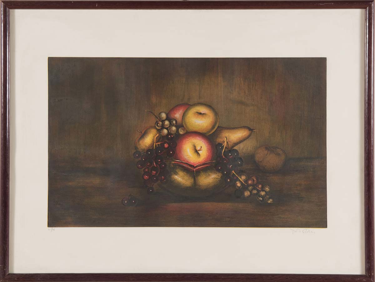 Paolo Cavalieri (XX), “Cesto di frutta”. Litografia a colori su carta, firmata in basso a destra Paolo Cavalieri, numero di tiratura in basso a sinistra 26/99, H mm 600x800, lastra mm 380x625