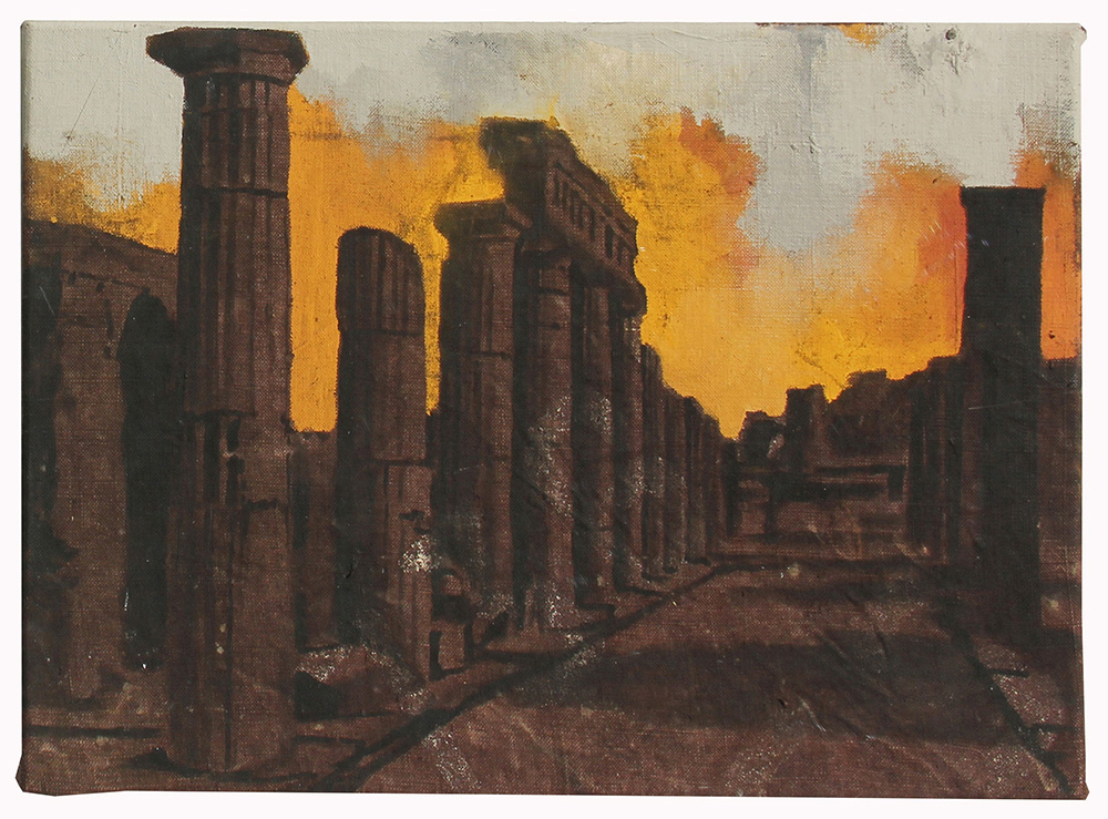 Luca PIGNATELLI (Milano 1962-06-22 ) Pompei 2003 olio su telone di copertura di vagone ferroviario cm. 40 x 60Firma, luogo, data, titolo "Luca Pignatelli, Milano, 2003, Pompei"; timbro di Italian Factory (al retro) Autentica dell'artista su fotografia Fotografia dell'artista con la sua opera