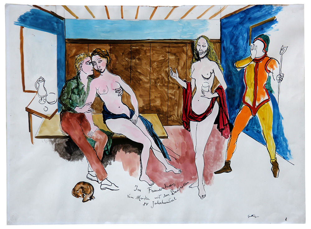 Renato GUTTUSO (Bagheria 1912-01-02 Roma 1987-01-17) Im frauenhaus Vom Meister mit den Baudrollen XV Jahrhundert 1971 tecnica mista su cartoncino cm. 51 x 71.3S.Pegoraro "Figure & figure", Galleria Marchetti, Roma, 2015, pp.46-47Firma "Guttuso" (in basso a destra); titolo "Im frauenhaus Vom Meister mit den Baudrollen XV Jahrhundert" (in basso al centro) Opera registrata presso gli Archivi Guttuso con n°1815411811