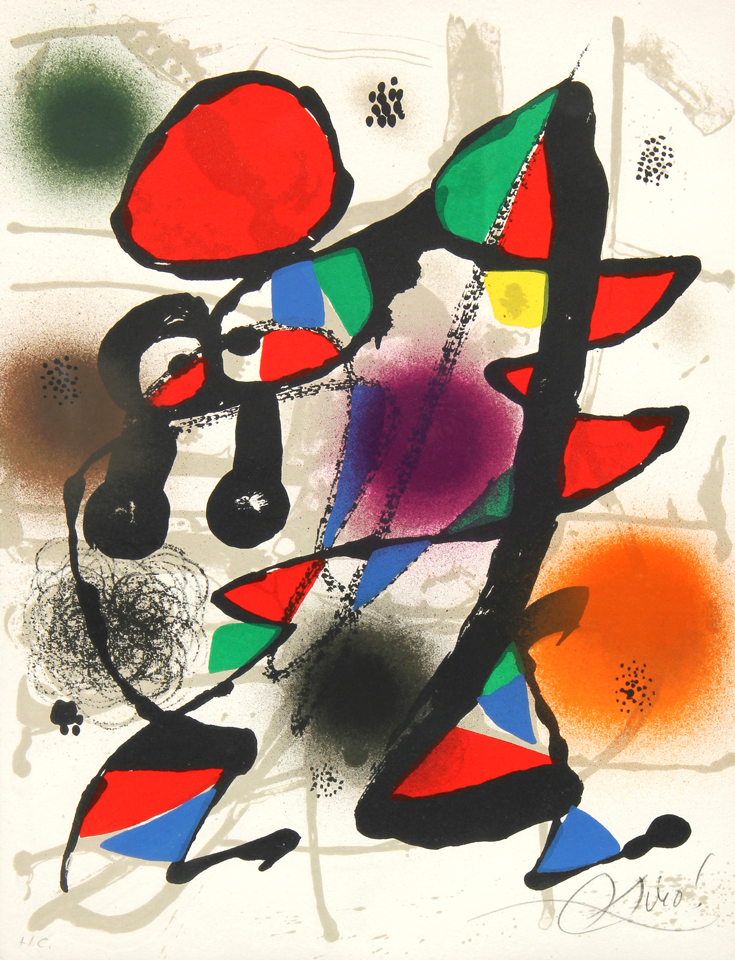 Joan MIRO' (Barcellona 1893-04-20 Palma di Maiorca 1983-12-25) Texte de Joan Teixidor 1977 litografia cm. 33.8 x 25.5"Mirò Lithograph VI 1976-1981", Maeght Publisher, Parigi, n° 1119, p. 45Firma "Mirò" (in basso a destra); edizione "H.C." (in basso a sinistra) Opere per Joan Mirò Lithographe III, 1977, che contiene 8 litografie, le 2 supplementari, tra cui questa, è tirata in 150 esemplari Certificato di autenticità della galleria Il Castello, Milano