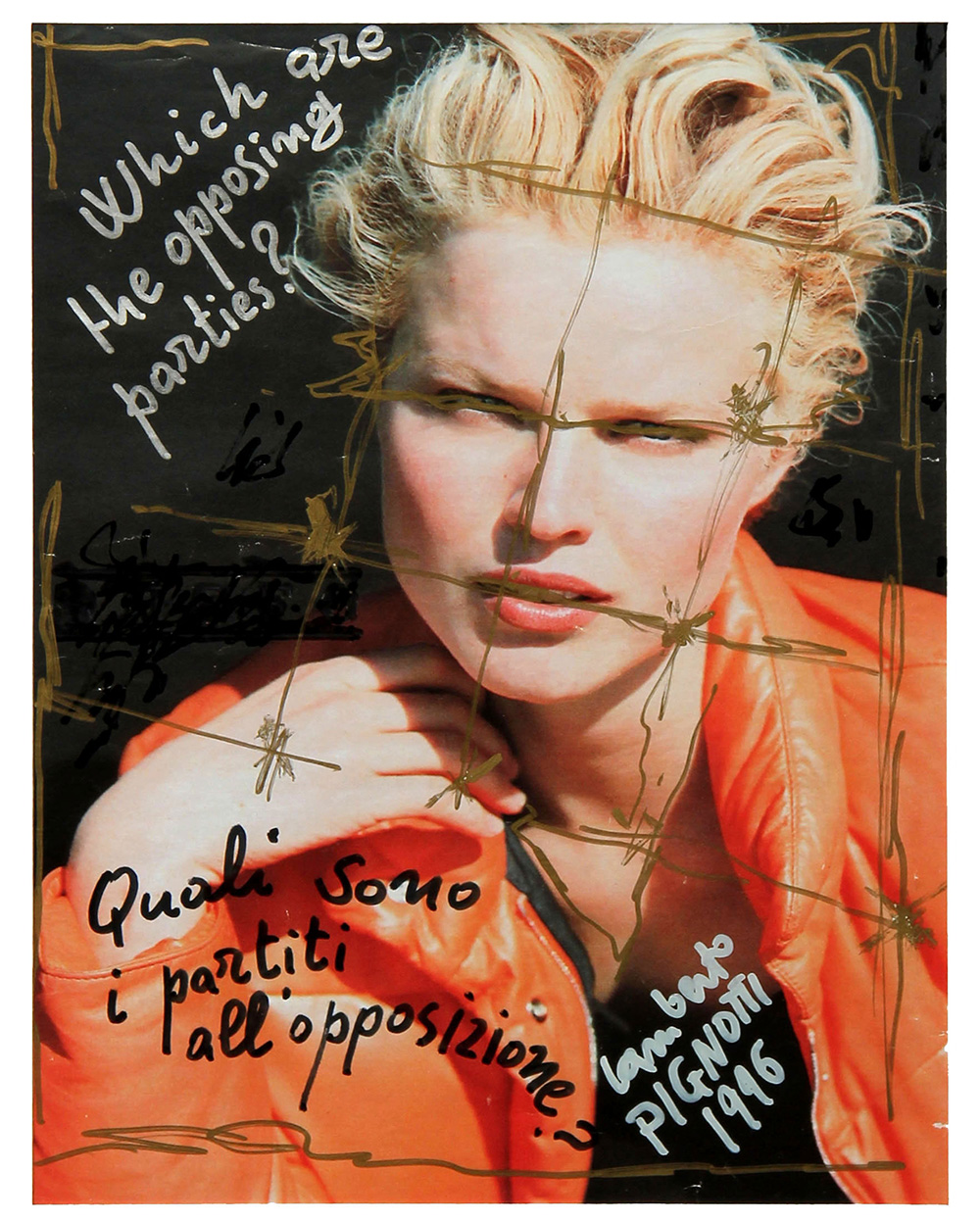 Lamberto PIGNOTTI (Firenze 1926-01-01 ) Which are the opposing parties 1996 tecnica mista su pagina di rivista cm. 27 x 20.5"Lamberto Pignotti. Parole immagini e...", Armanda Gori Arte, catalogo della mostra, Prato 2008, p. 120Titolo "Which are the opposing parties?" (in alto a sinistra); firma, data "Lamberto Pignotti, 1996" (in basso a destra)