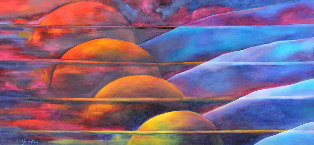 Simonetta GAGLIANO (Roma 1956 ) Hai tu disteso il firmamento solido come specchio di metallo fuso? 2007 olio su tela cm. 70 x 145Firma "Gagliano" (in basso a sinistra) Firma, titolo, tecnica, misure, data, firma "Simonetta Gagliano, Hai tu disteso il firmamento solido come specchio di metallo fuso?, olio su tela, cm. 70x145, 2007, Simonetta Gagliano" (al retro)