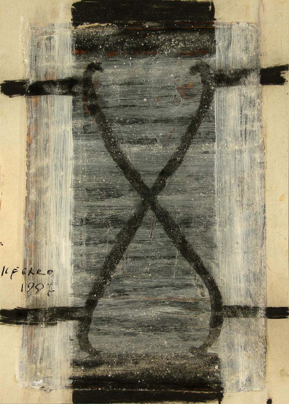 Piero PIZZI CANNELLA (Rocca di Papa 1955-11-20 ) Il ferro 1987 tecnica mista su cartone cm. 70 x 50Titolo, data "Il ferro, 1987" (in basso a sinistra) Firma, data "Pizzi Cannella 1987" (al retro) Autentica dell'artista su fotografia