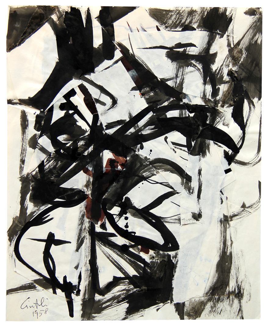 Claudio CINTOLI (Imola, 1935 Roma, 1978 ) Senza titolo 1958 tecnica mista e collage su carta cm. 28.6 x 21.7Firma, data "Cintoli, 1958" (in basso a sinistra) Firma, data "Cintoli, 58" (al retro)