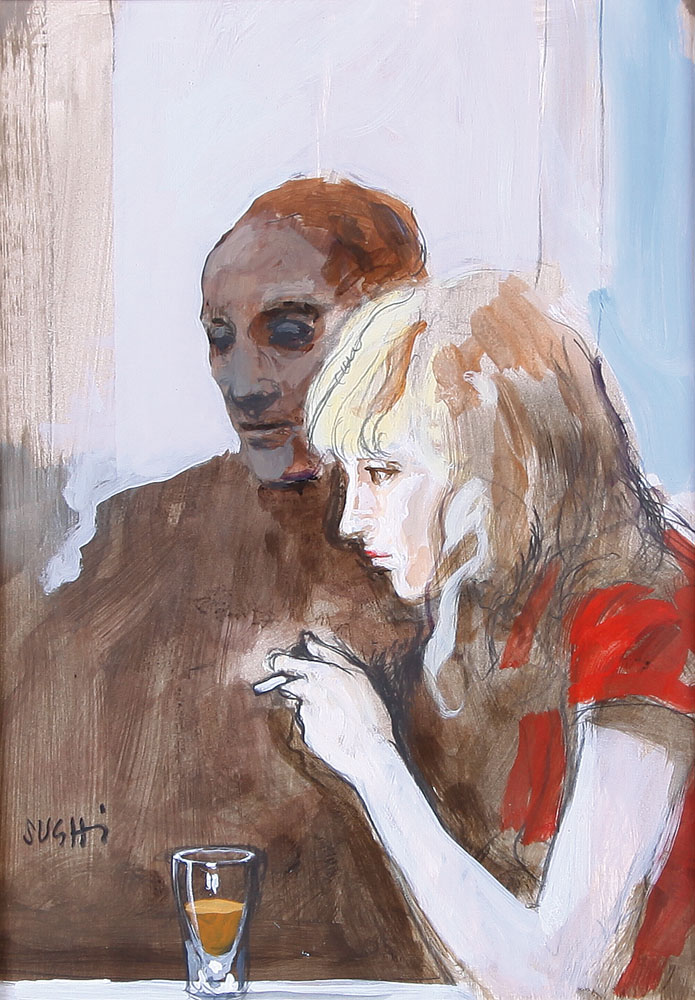 ALBERTO SUGHI Cesena (Fo) 05/10/1928 - Rimini (Rn) 31/03/2012 Al bar tempera su carta cm. 50x35, firma in basso a sinistra, dedica ad personam datata e firmata dall'artista al retro.